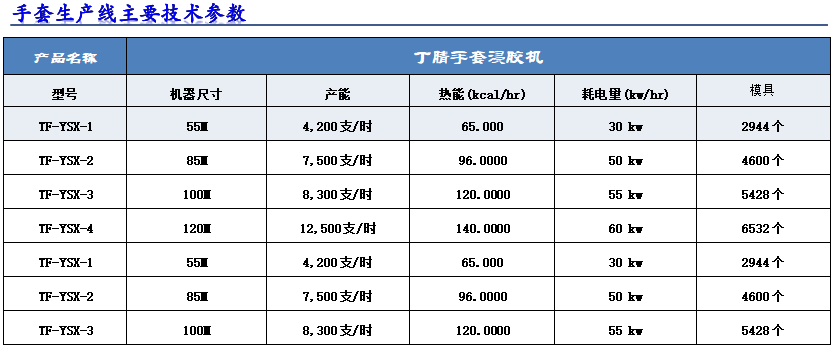 1.天然乳膠/丁腈手套生產(chǎn)線采用連續(xù)生產(chǎn)方式和直浸方式,成膜均勻,可作醫(yī)用手術(shù)手套,檢查手套,有粉、無粉涂層手套。